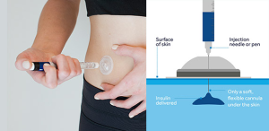 Ele permite a aplicação da insulina usando as seringas ou canetas de uso habitual, sempre com agulhas de 5 a 8mm, mas ao invés de furar a pele a cada vez passamos a injetar diretamente na cânula que já está no subcutâneo.